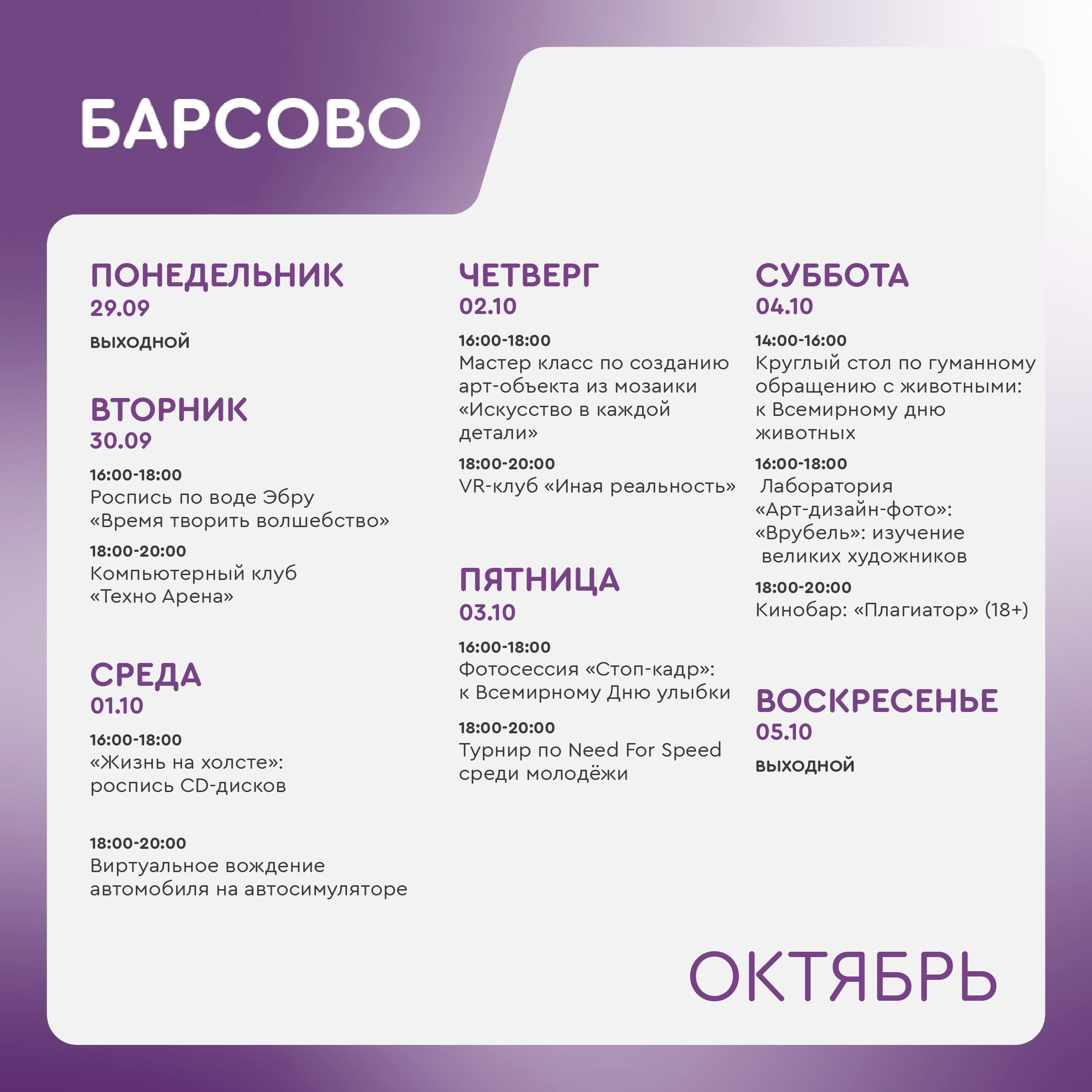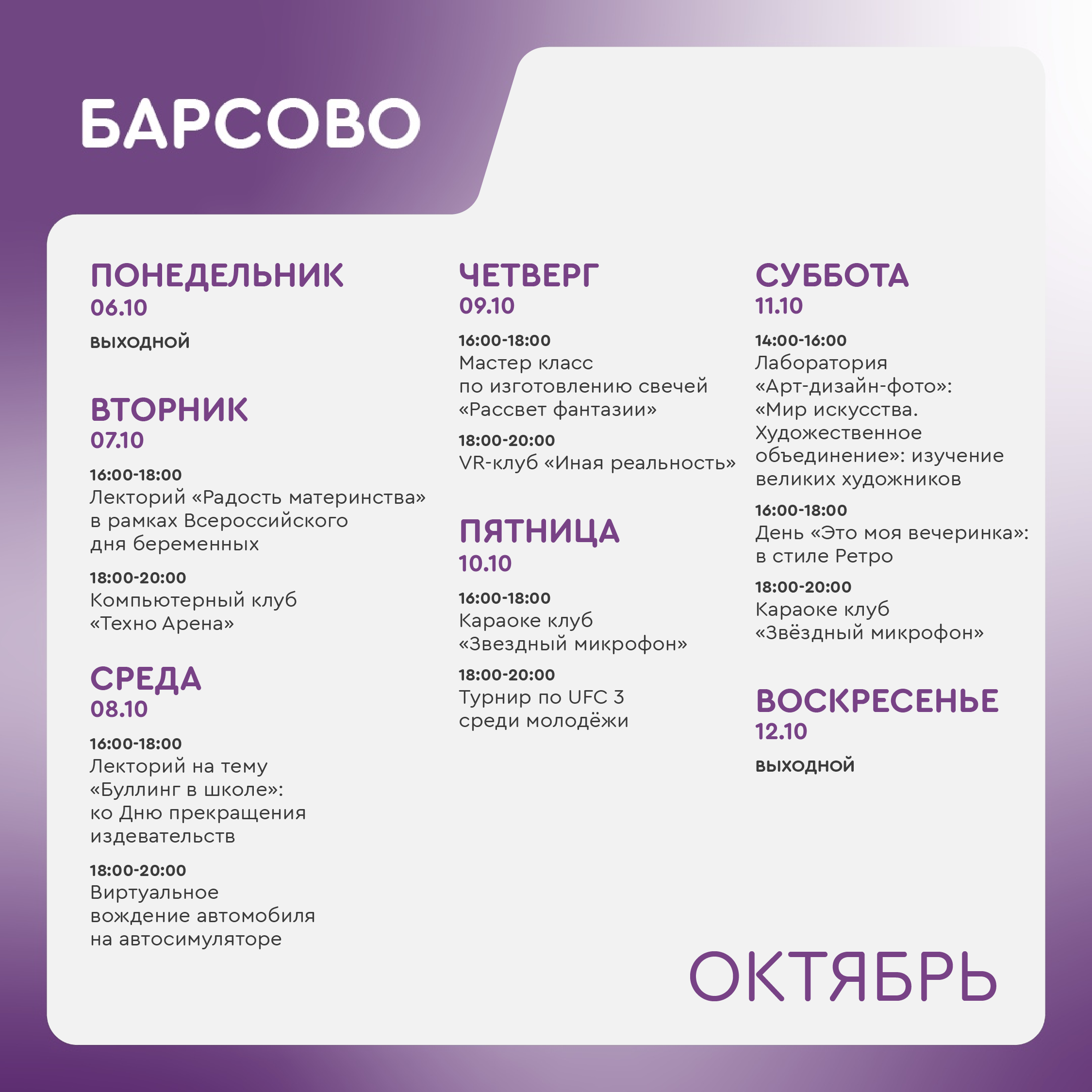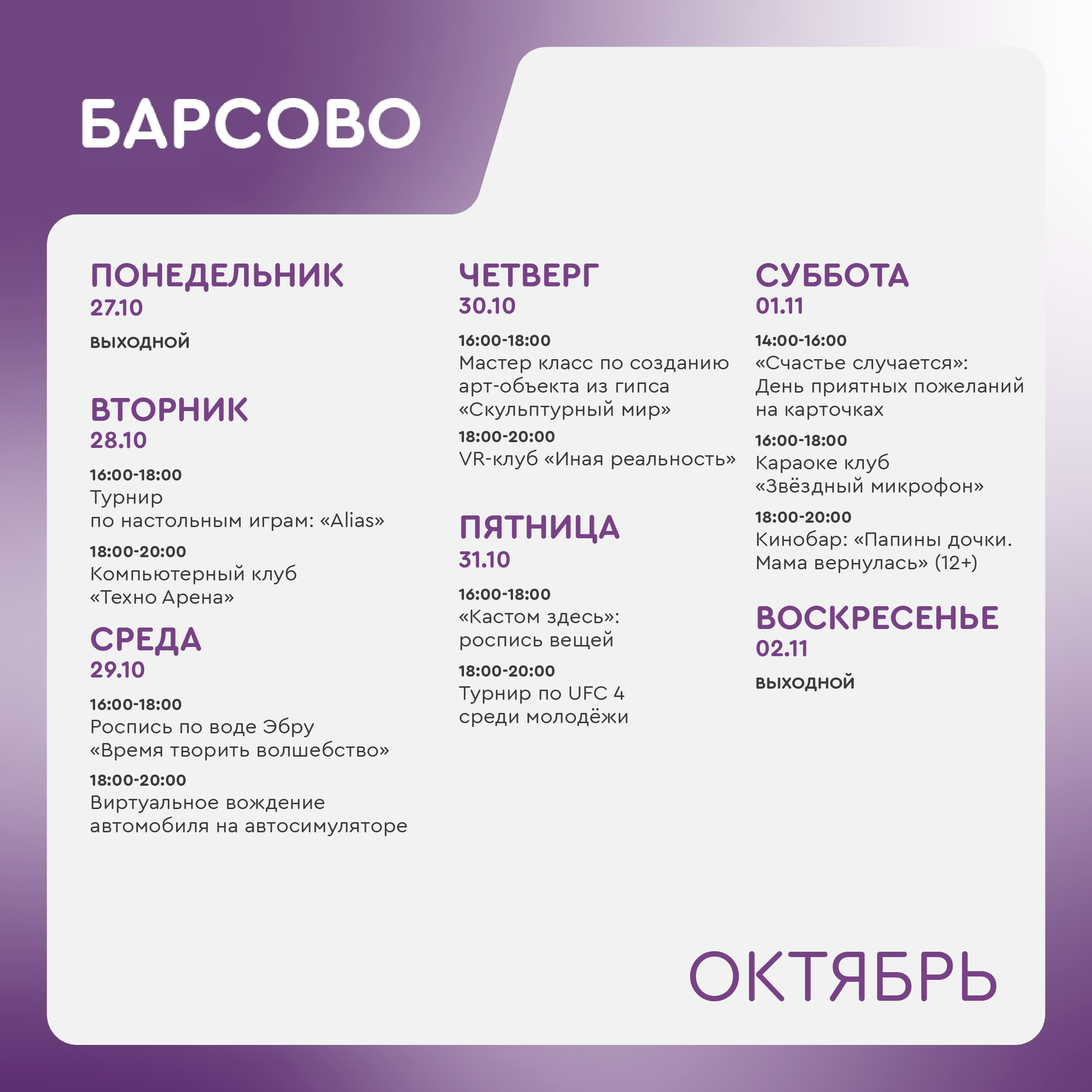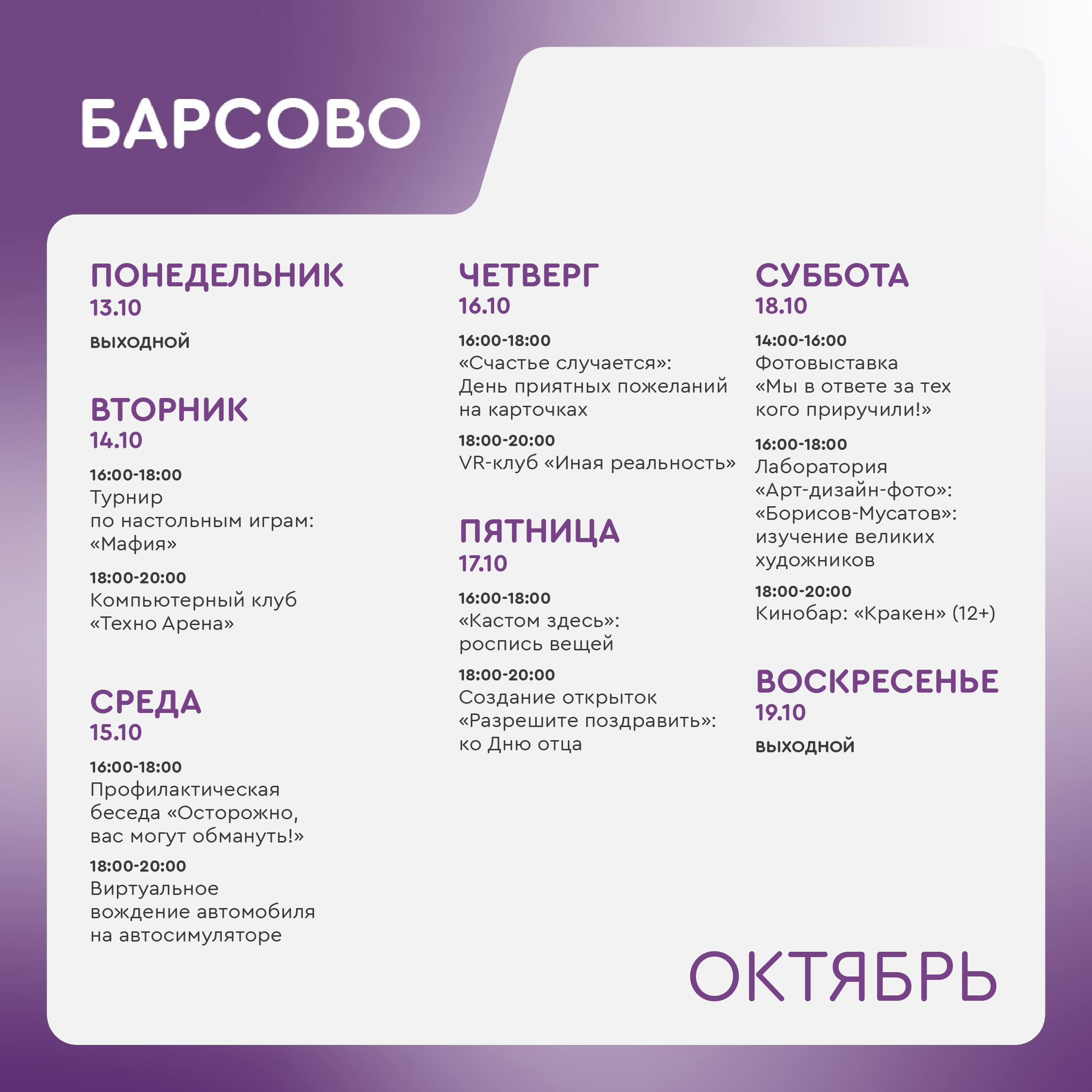 Воскресенье, понедельник - выходной