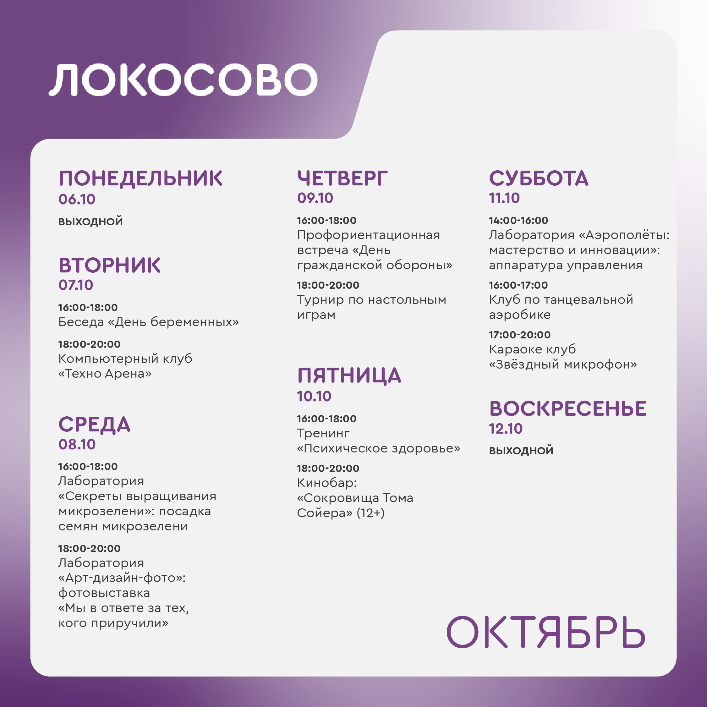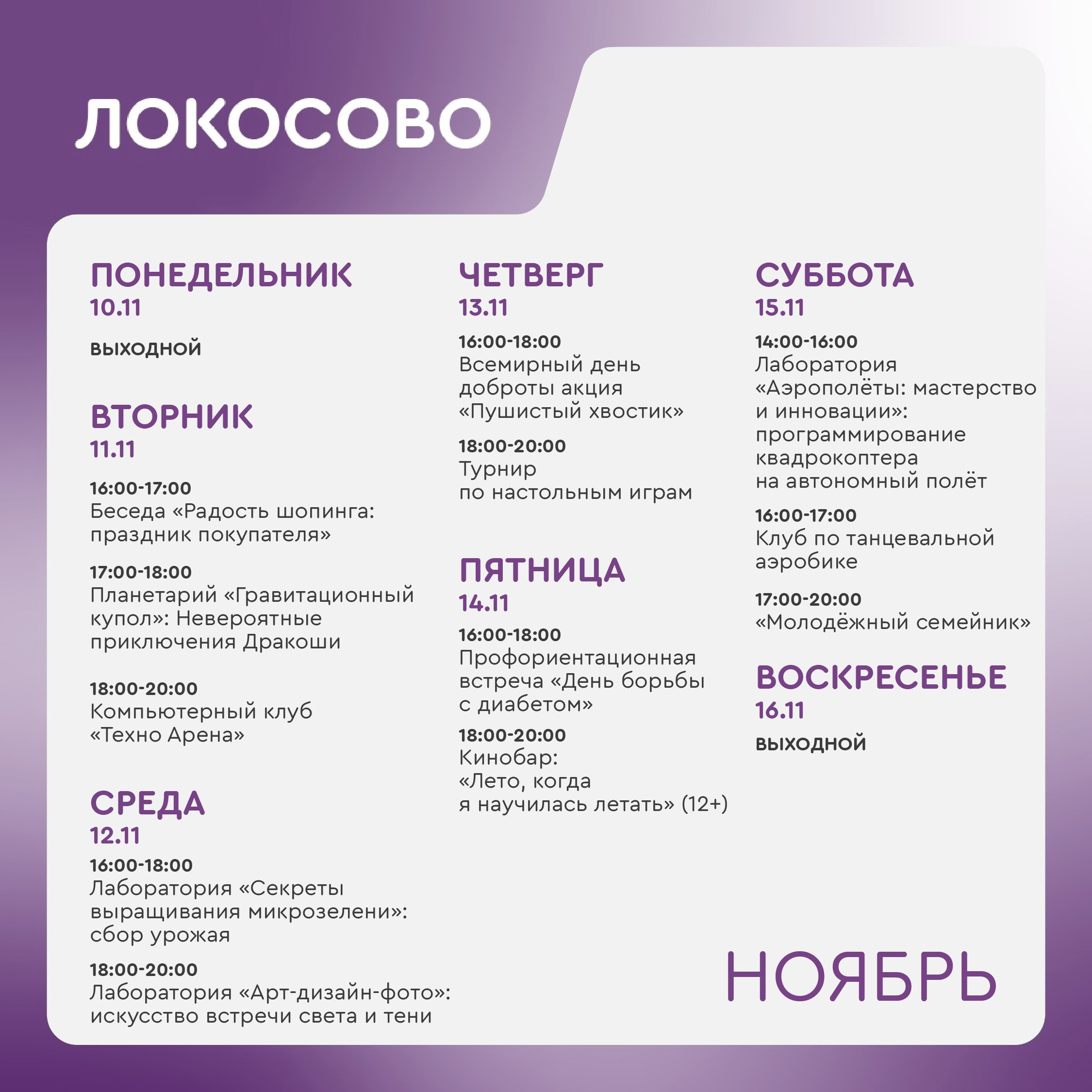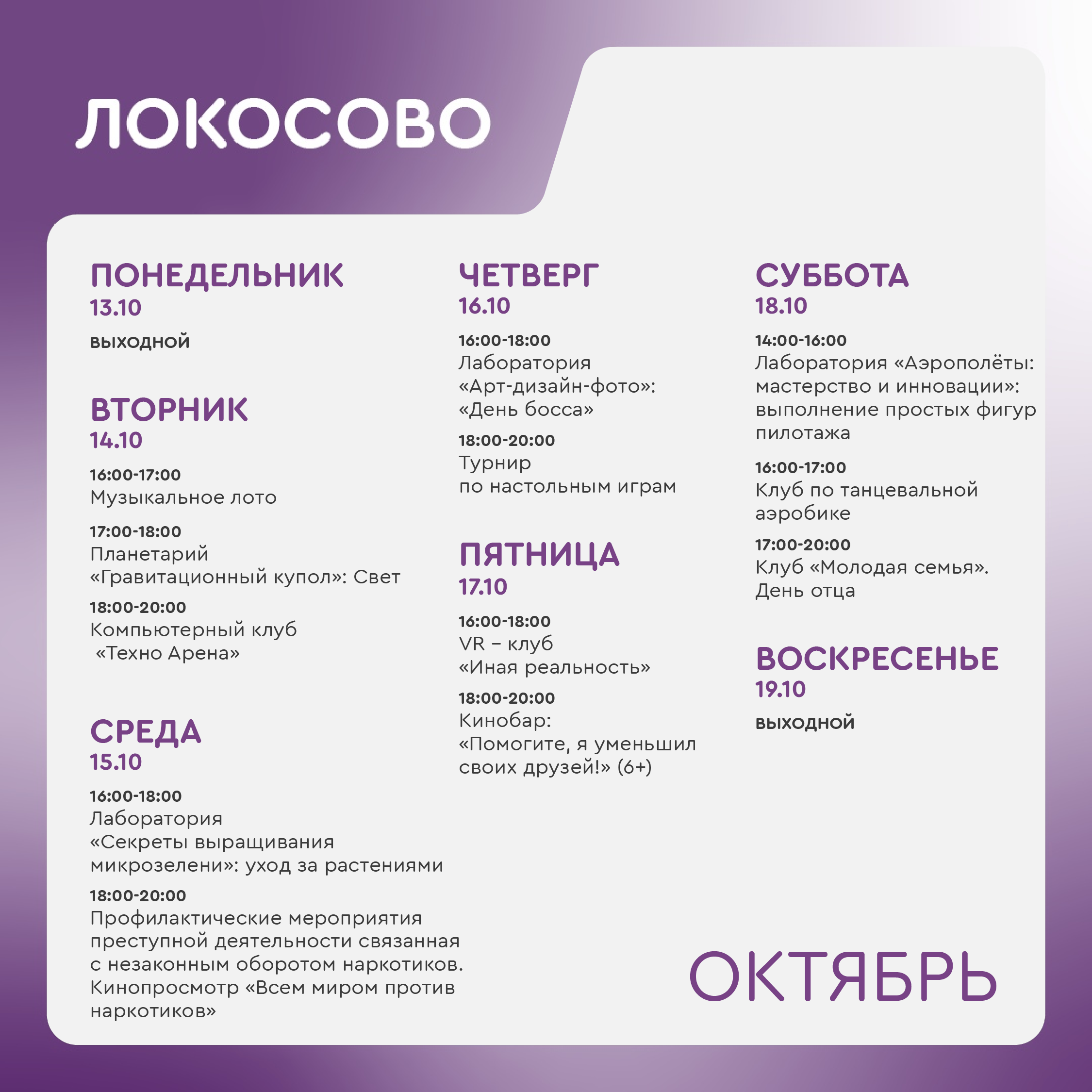 +7 918 564-96-89 - Шиль Людмила Анатольевна, руководитель молодежного центра Локосово (ул. Советская, 26/1).