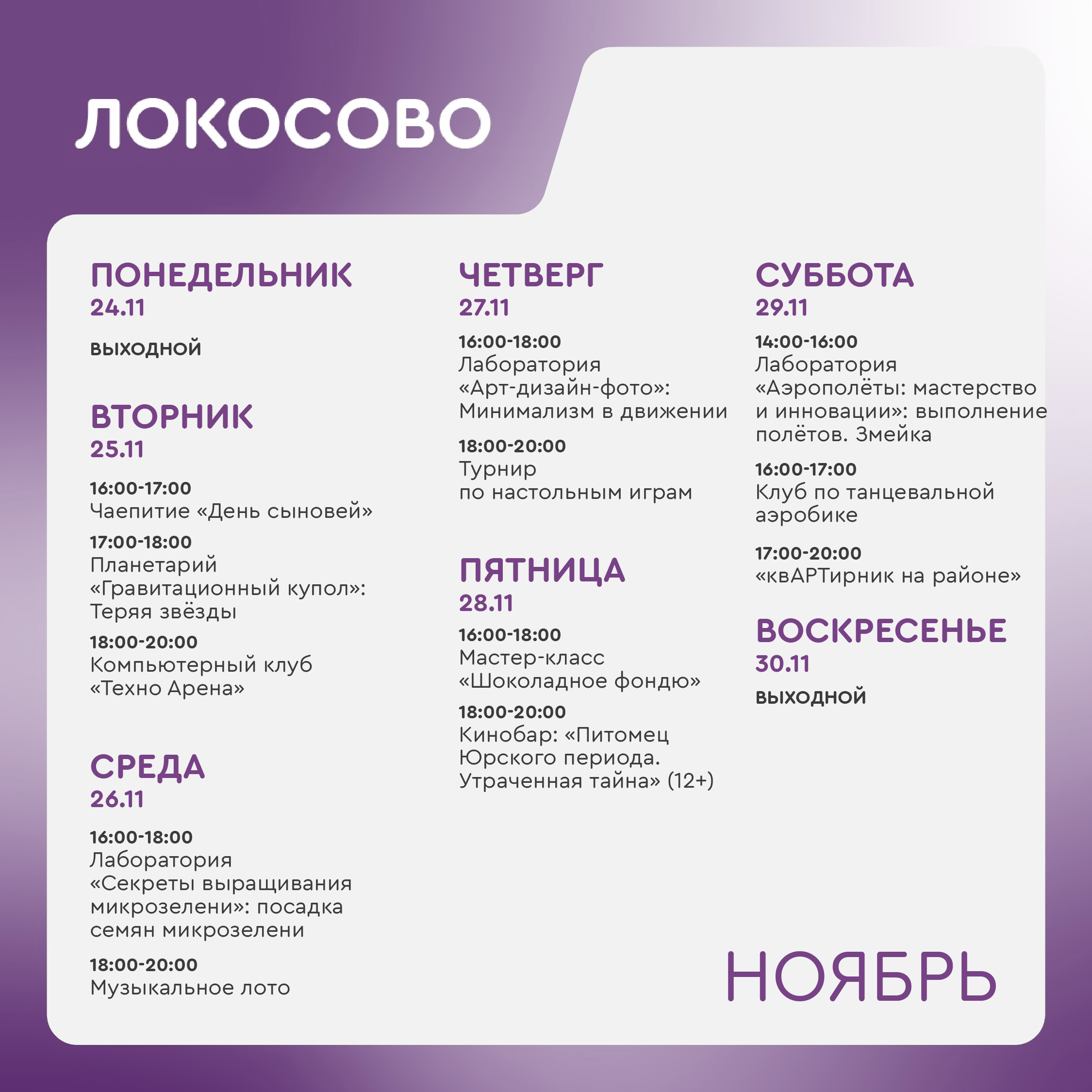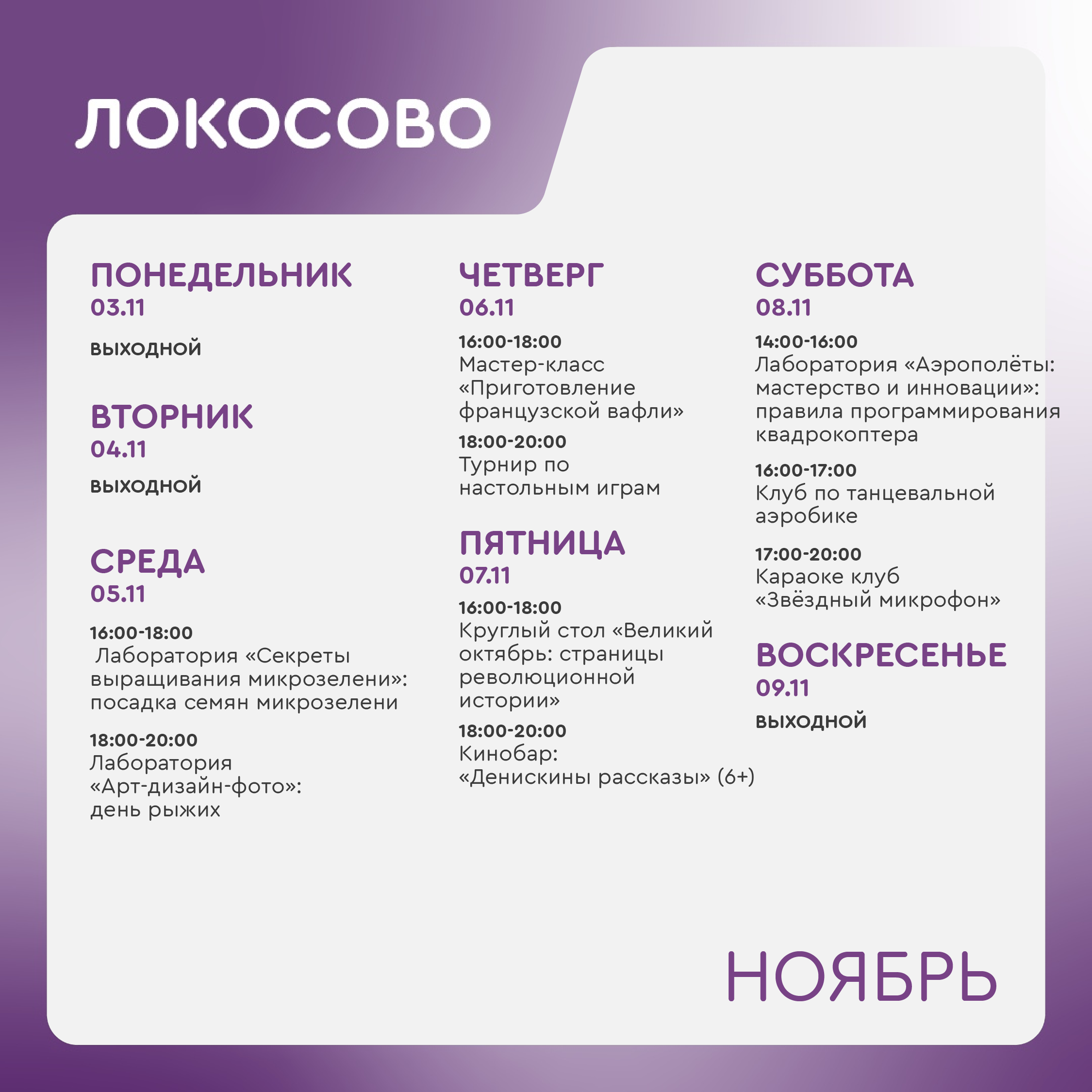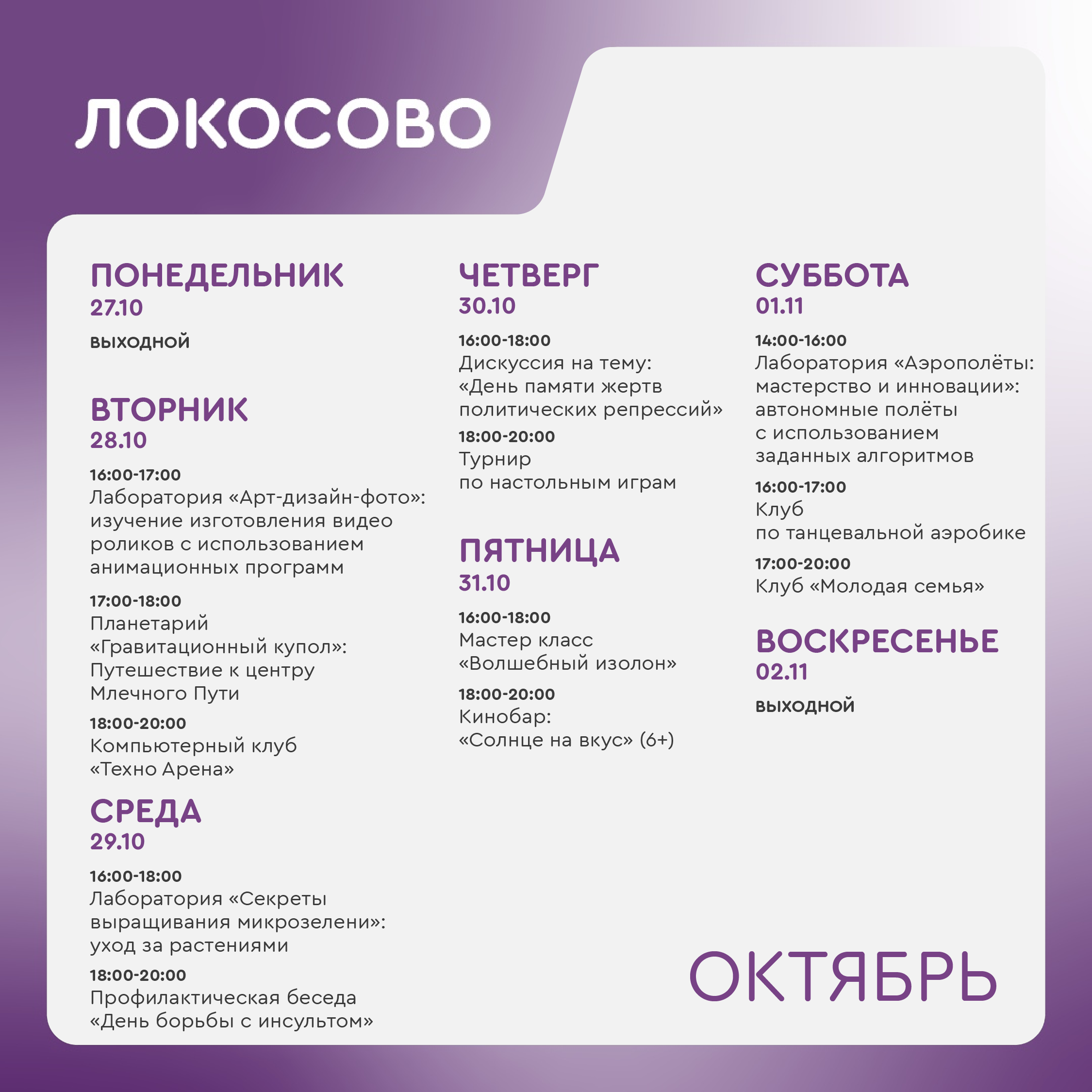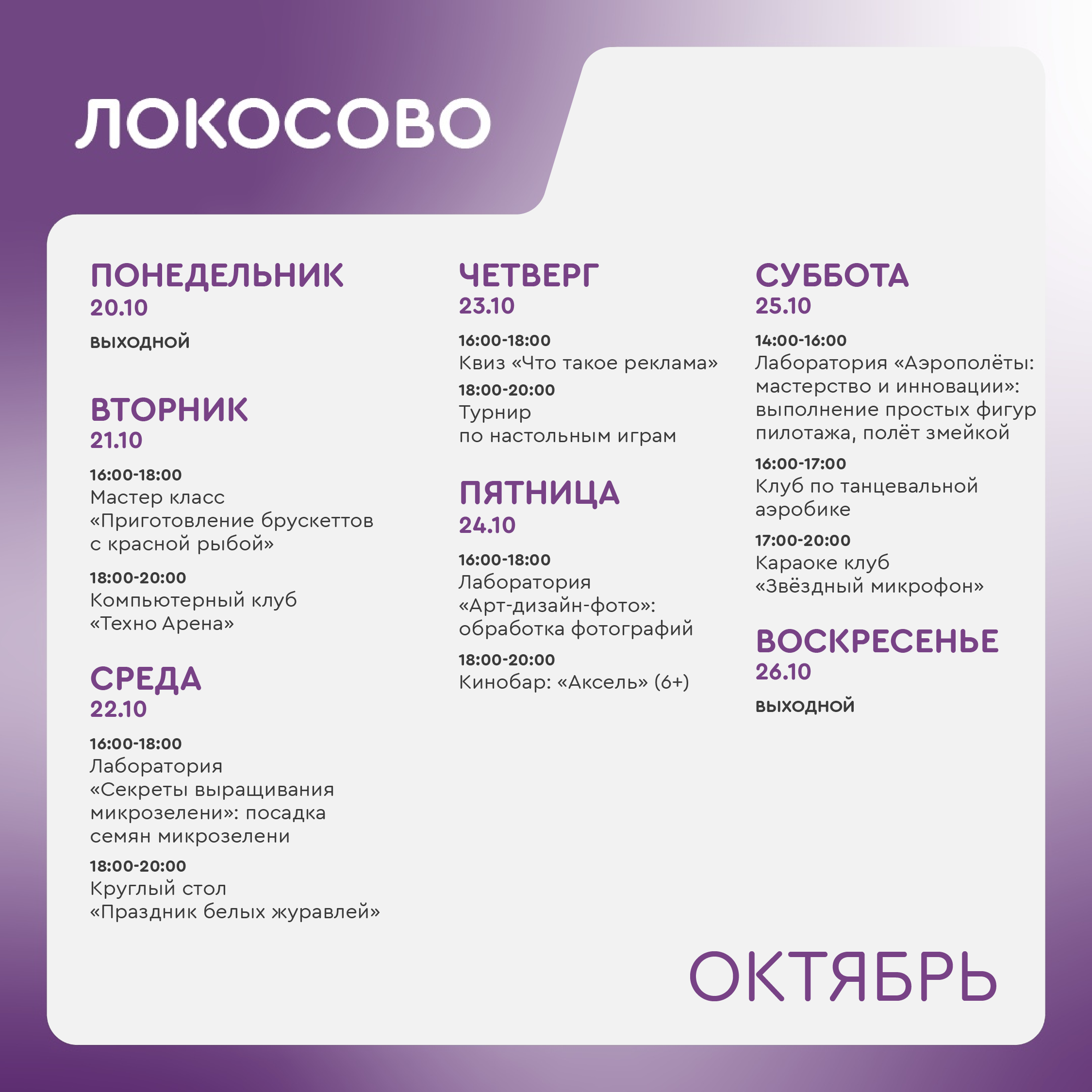 +7 918 564-96-89 - Шиль Людмила Анатольевна, руководитель молодежного центра Локосово (ул. Советская, 26/1).