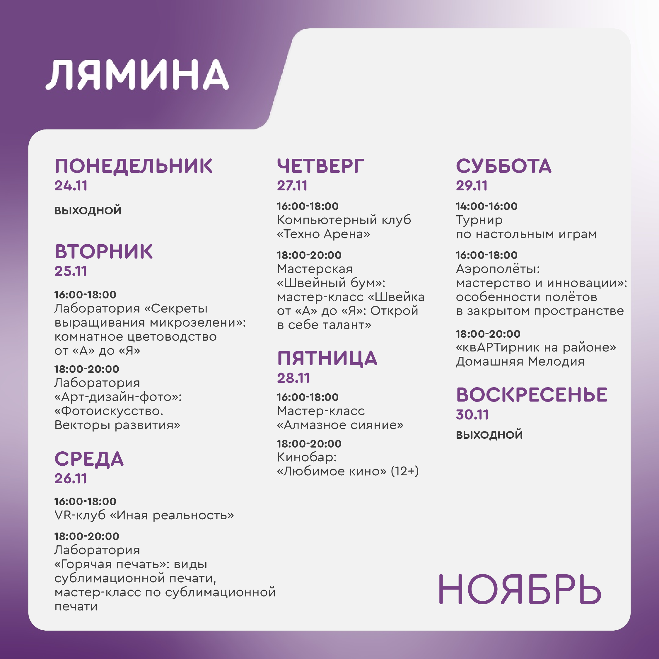 Воскресенье, понедельник - выходной