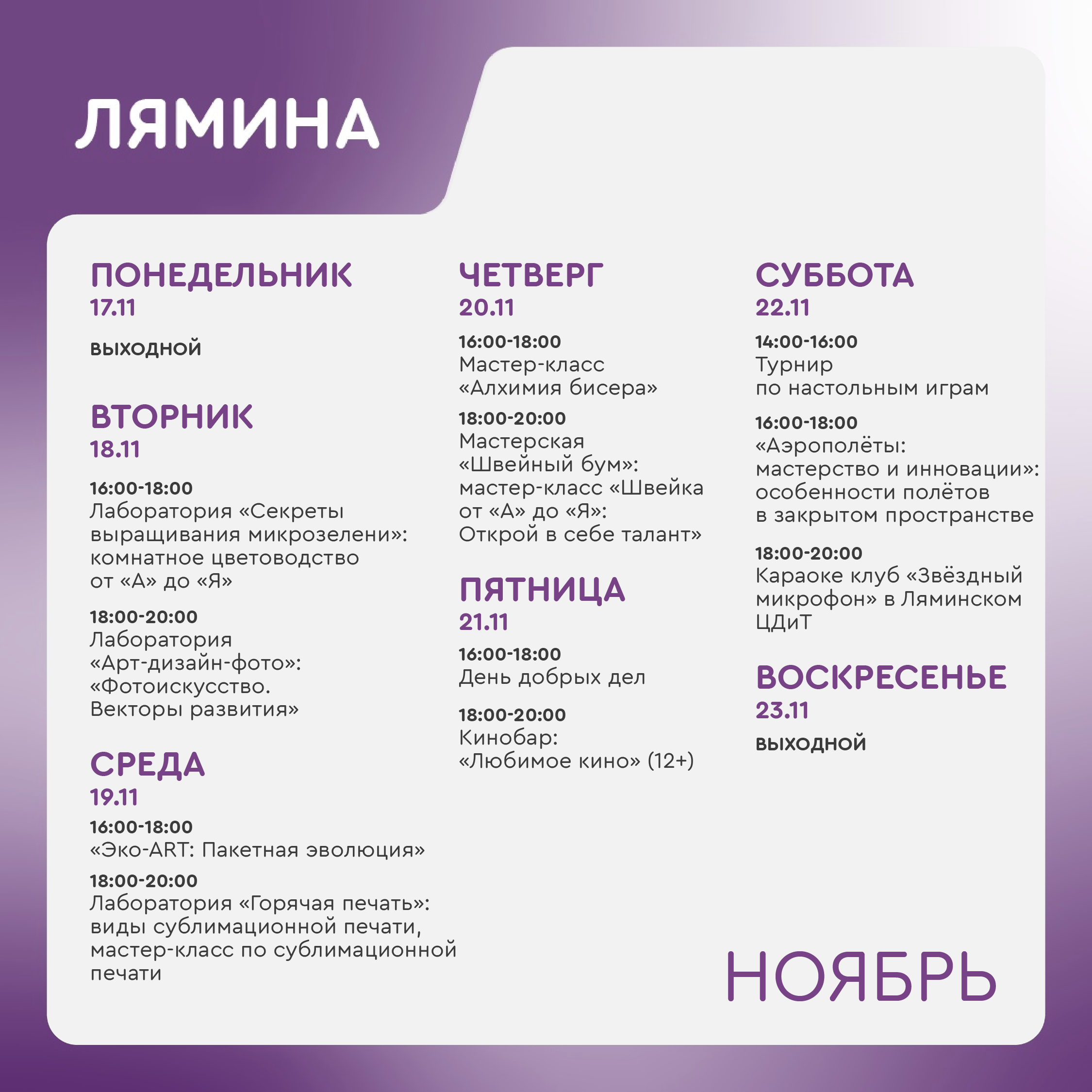 +7 912 997-80-20 - Демина Марина Владимировна, руководитель молодёжного центра Лямина (ул. Центральная, 11).