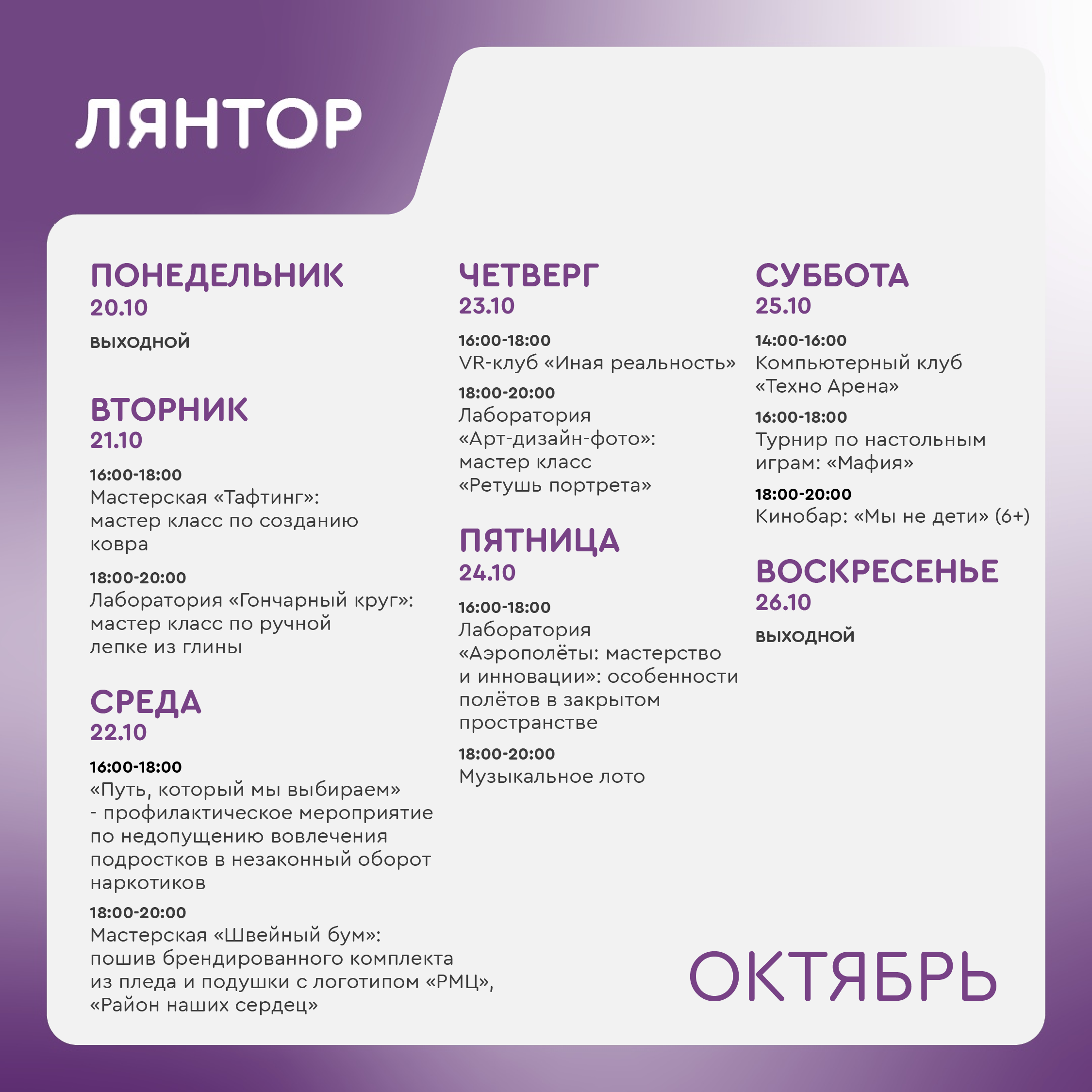 +7 912 908-40-08 - Фаслахова Регина Мирзагитовна, руководитель молодежного центра в Нижнесортымском (ул.Нефтяников д.7А).