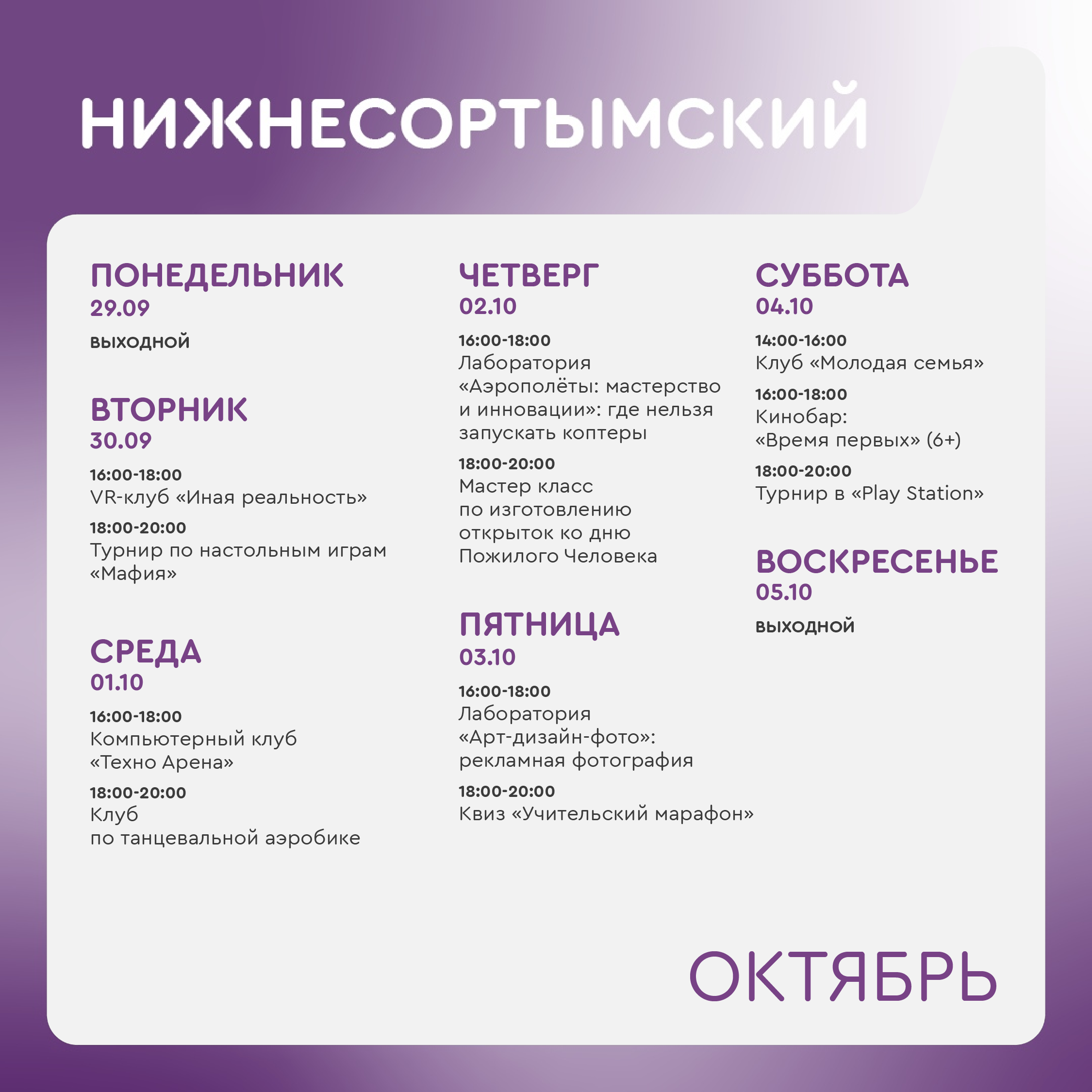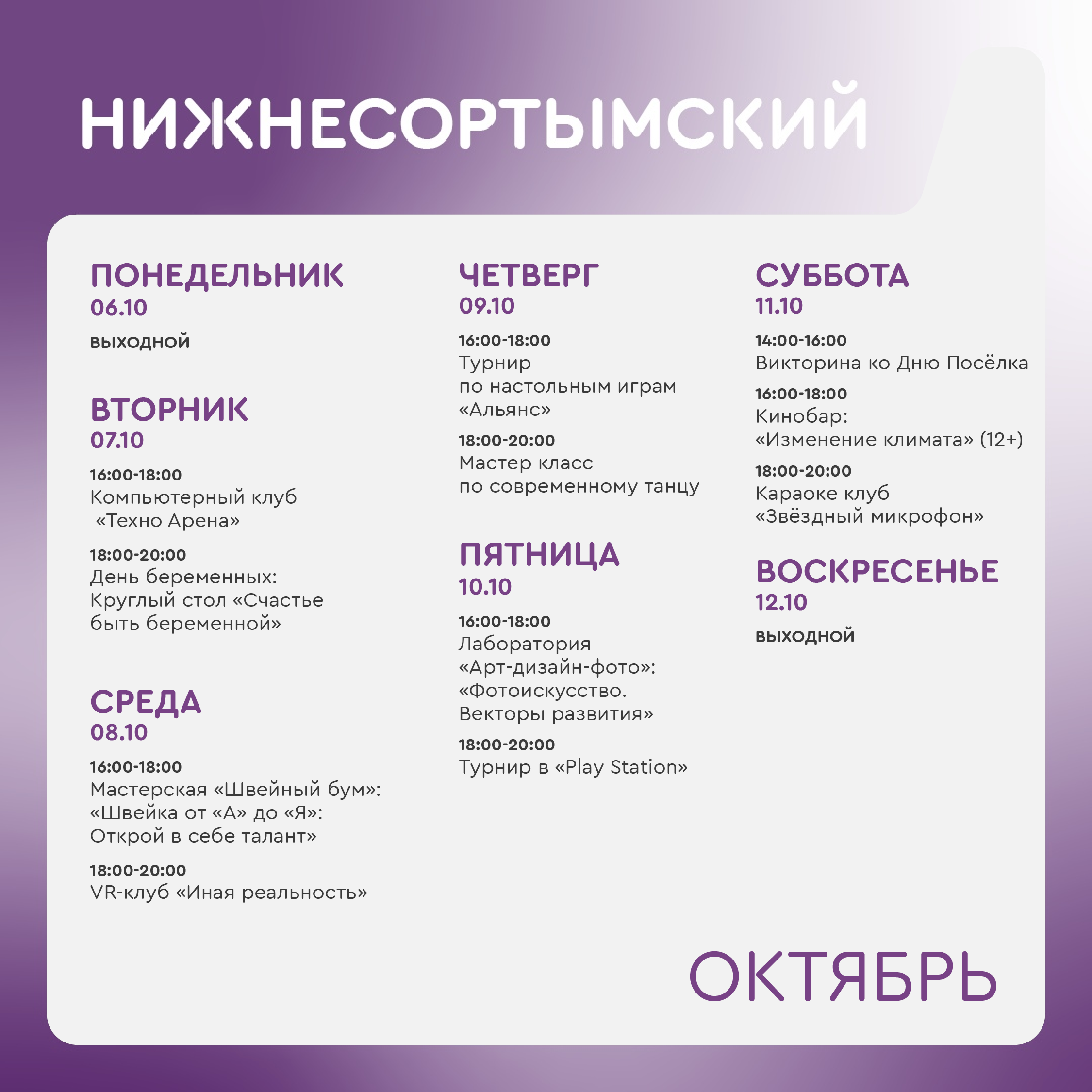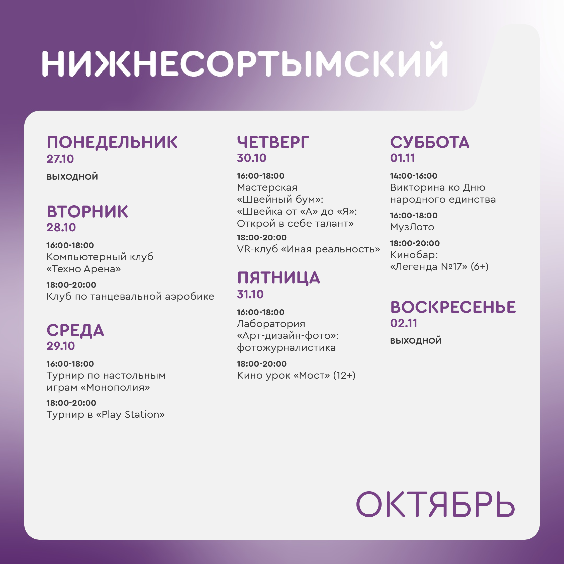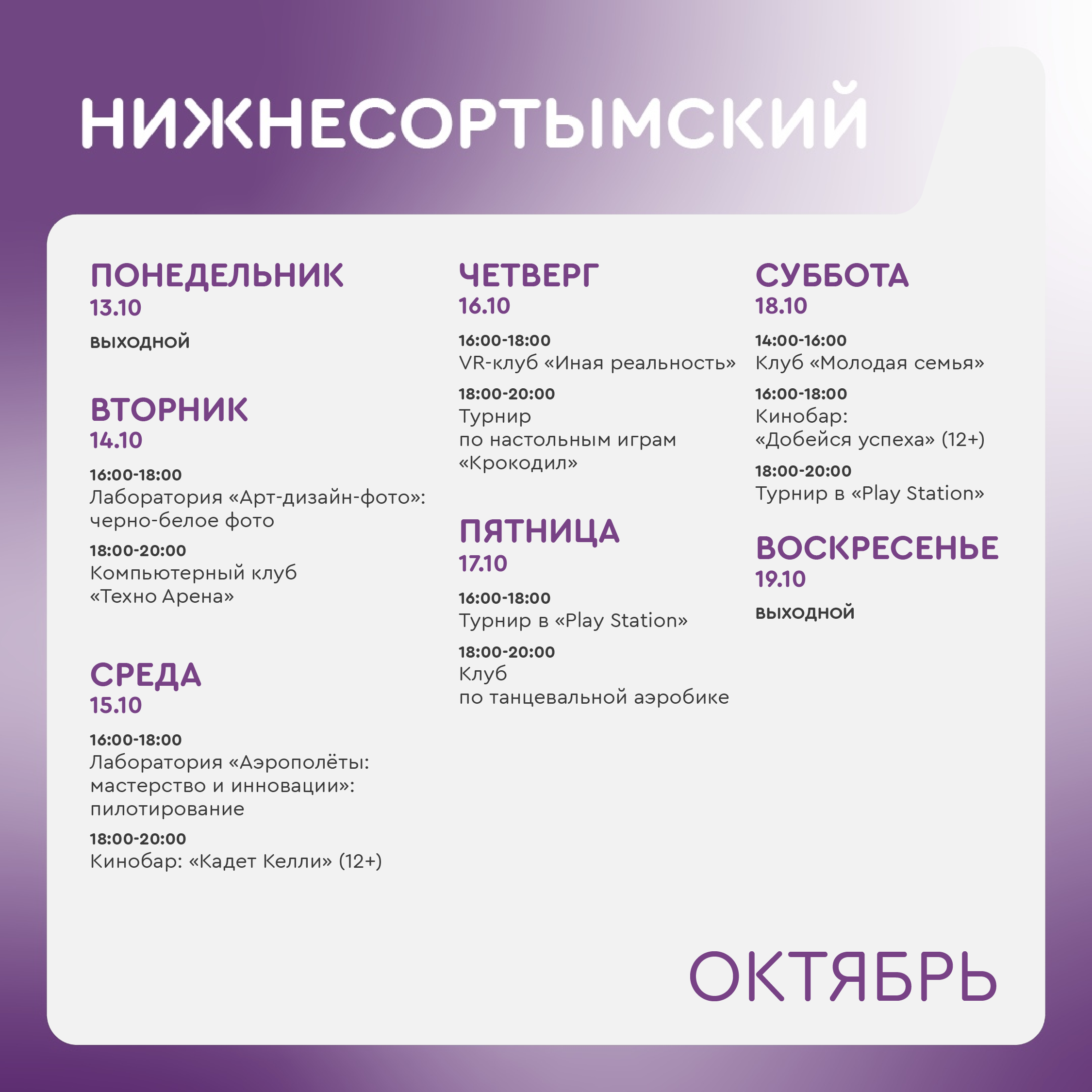 +7 912 908-40-08 - Фаслахова Регина Мирзагитовна, руководитель молодежного центра в Нижнесортымском (ул.Нефтяников д.7А).