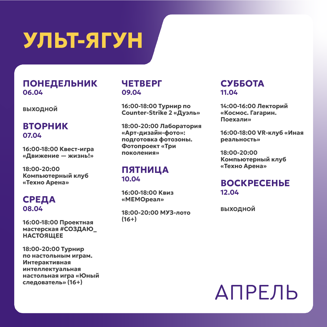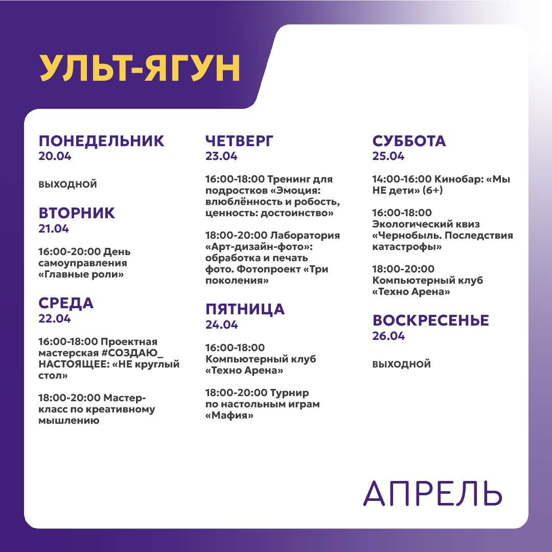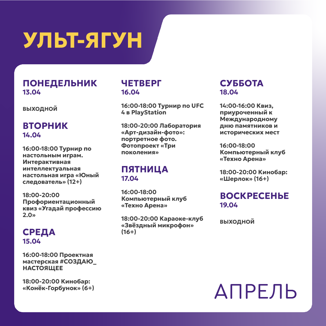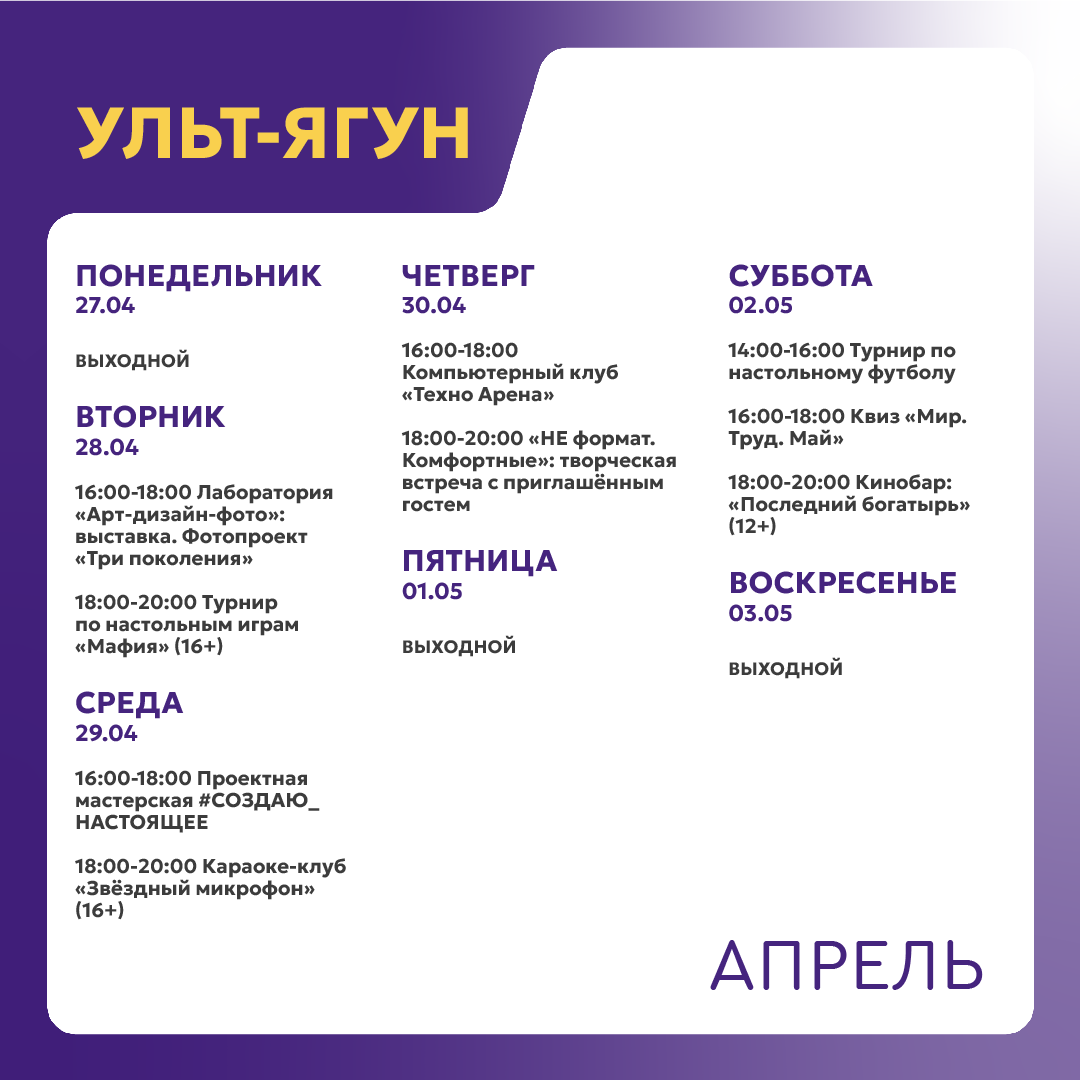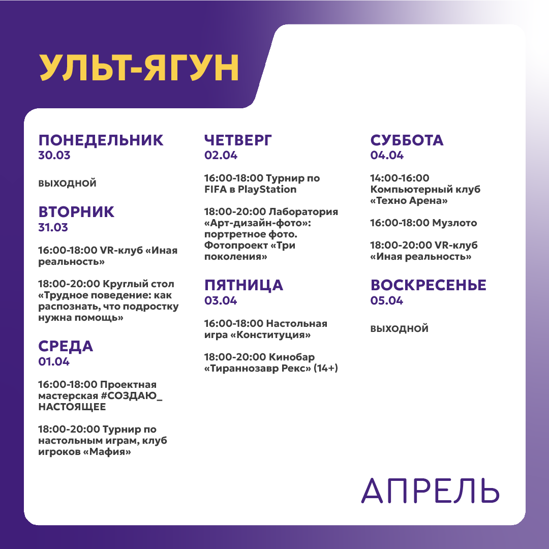 +7 996 446-05-28 - Посканова Маргарита Михайловна, руководитель молодёжного центра Ульт-Ягуна (ул. 35 лет Победы д. 1/1А).