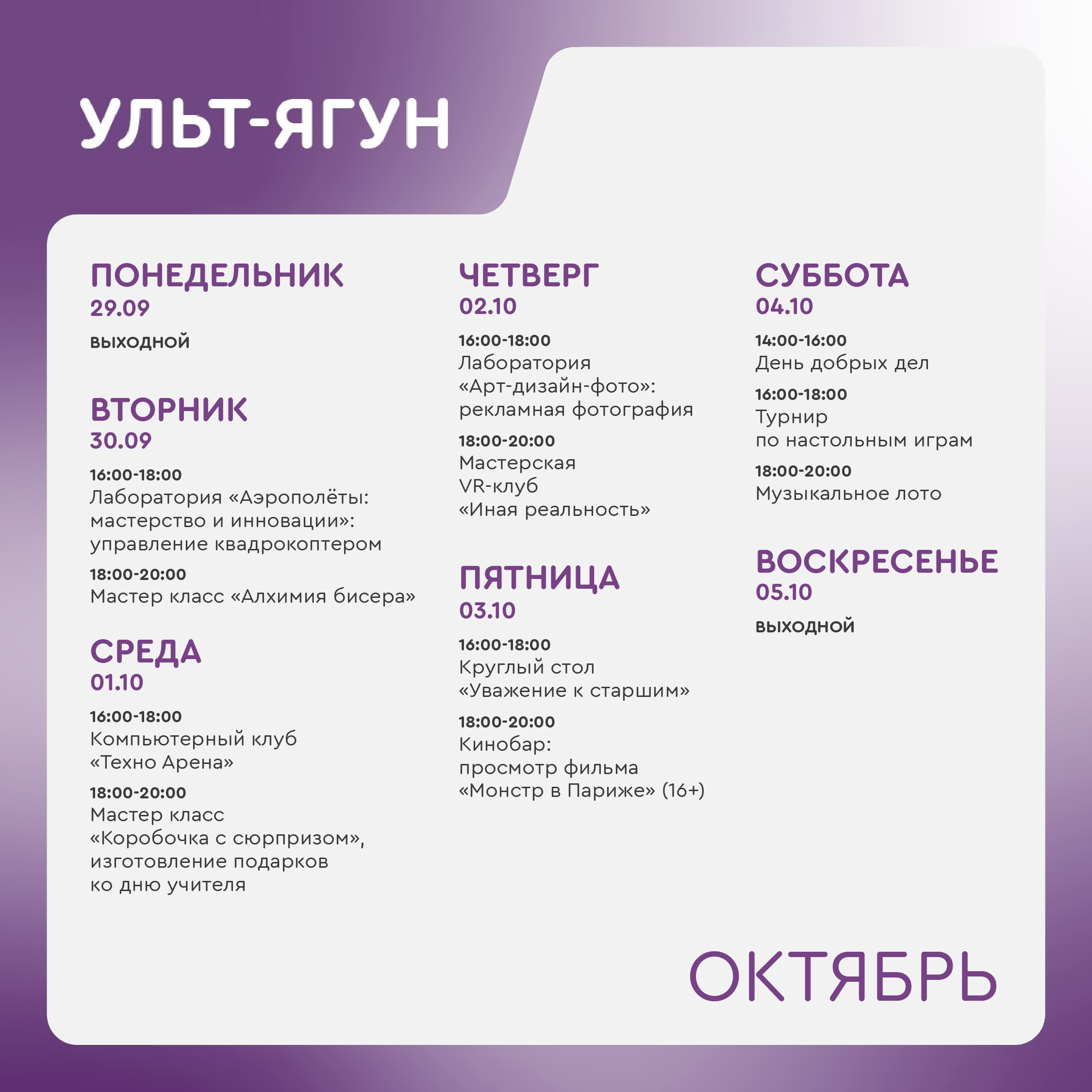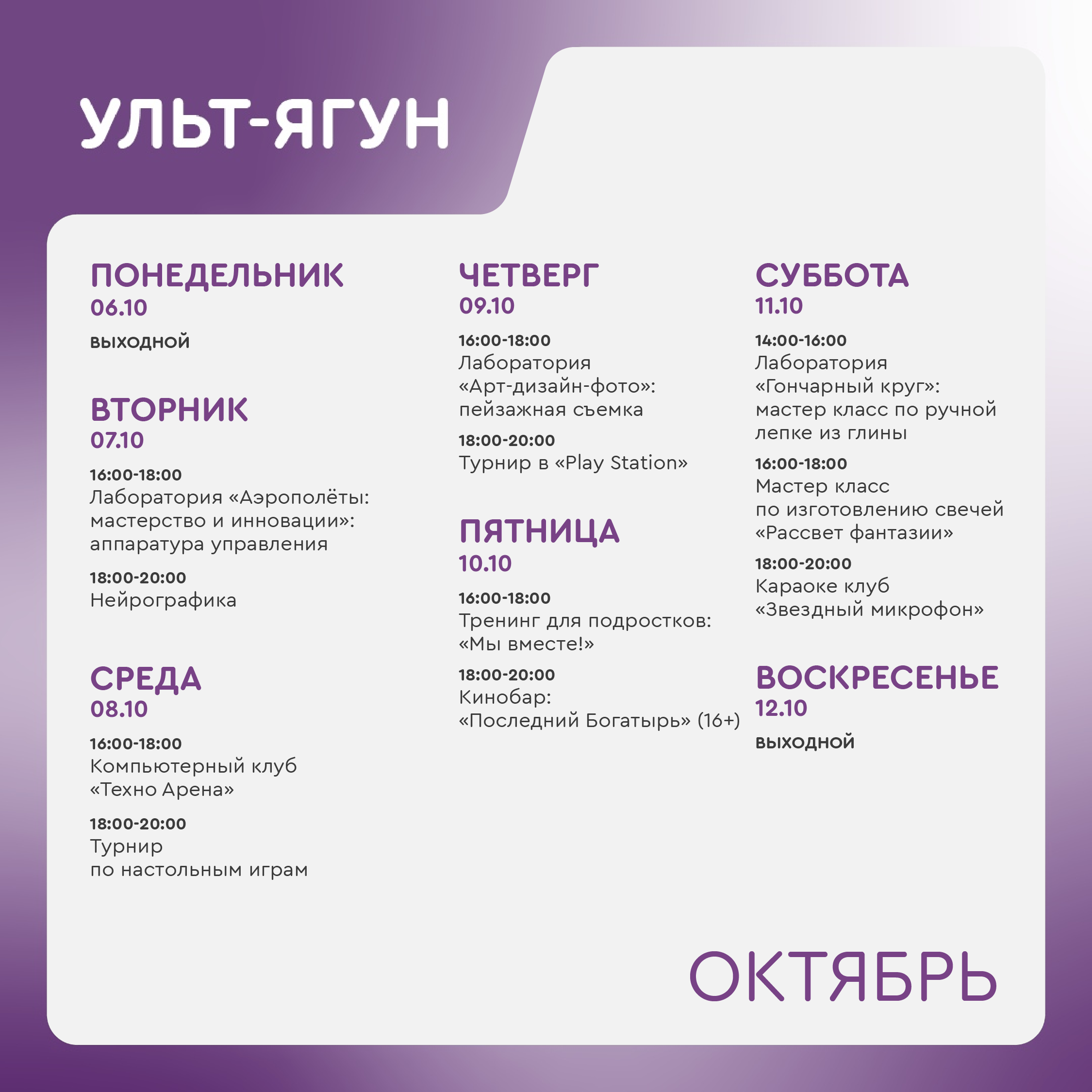 +7 346 255-07-18 - отдел реализации основных направлений молодежной политики МАУ "РМЦ". Адрес молодежного центра в Ульт-Ягуне: ул. 35 лет Победы д. 1/1А.